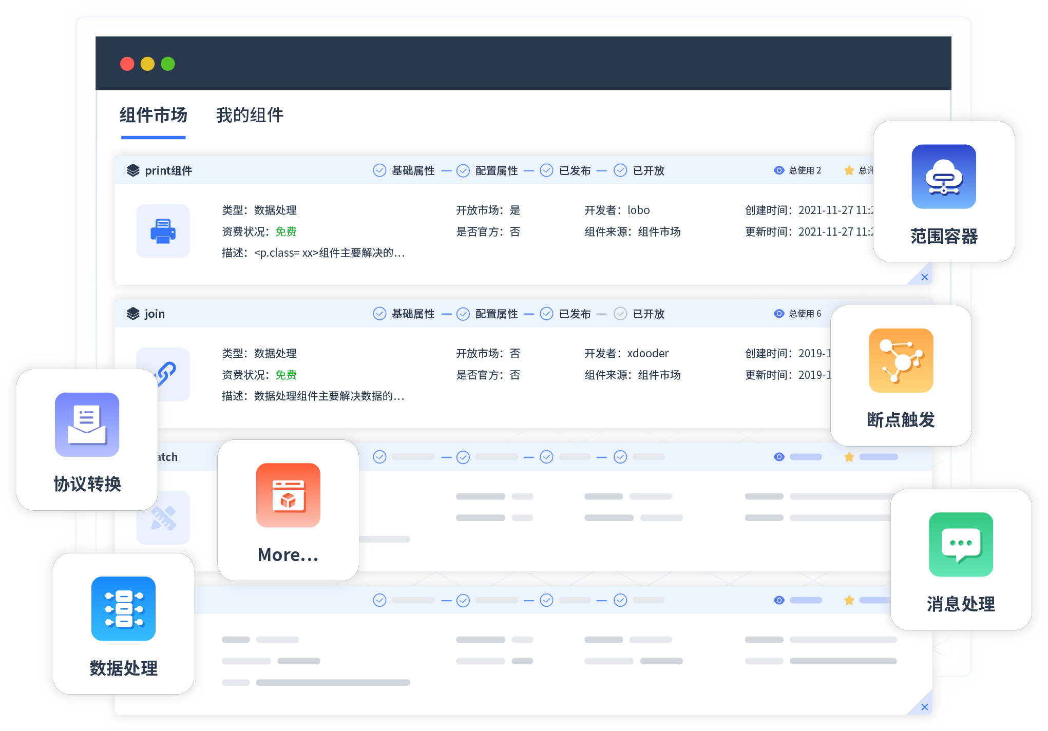 针对集成场景,,,钱能钱包提供组件市场,,例如协议转换、、、、消息处理、、文件操作等。。。除平台提供的组件外,,,客户可以自定义所需组件。。