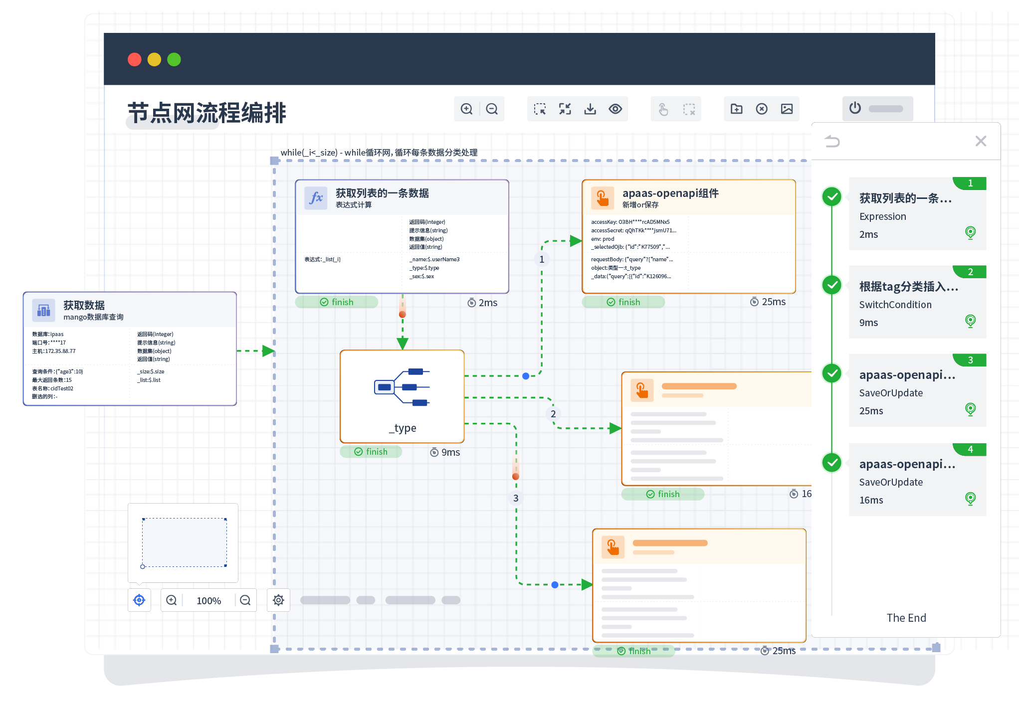 针对集成场景,,组件定义后支持进行流程编制,,,不同于传统代码方式,,通过图形化展示,,支持在线调试、、、日志查看和运行回放。。。